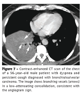 The angiogram sign can be seen on contrast-enhanced CT scans and consists of branching pulmonary vessels in a low-attenuating consolidation (Figure 7), usually corresponding to air spaces filled with mucin. First described as being specific to the pneumonic form of BAC, the angiogram sign can be seen in numerous entities, such as infectious pneumonia, pulmonary edema, postobstructive pneumonia, lymphoma, and metastases.(19)