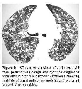 The diffuse form of BAC represents a multifocal origin, endobronchial dissemination, hematogenous metastases, or any combination of these patterns. Consolidation, nodules (Figure 9), ground-glass opacities, air bronchograms, and cysts (Figure 10), as well as peripheral distribution and distribution in the lower lobes, characterize this pattern.(20) Satellite lesions can be seen in BAC and in pneumonia.(18)