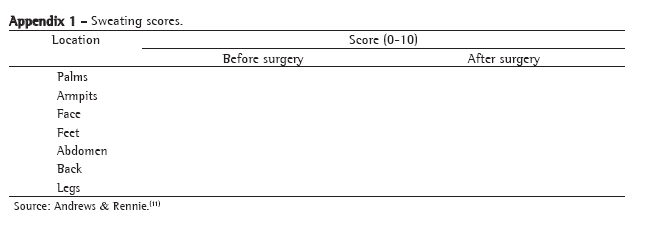 11. Andrews BT, Rennie JA. Predicting changes in the distribution of sweating following thoracoscopic sympathectomy. Br J Surg. 1997;84(12):1702-4.