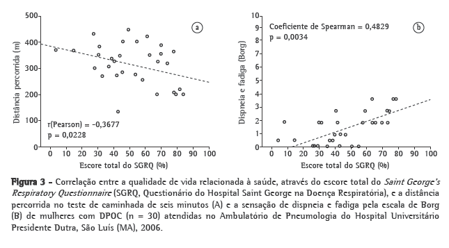 A QVRS ainda manteve correlação negativa com a distância percorrida no TC6 e correlação positiva com a sensação de dispneia e fadiga medida pela escala de Borg (Figura 3).