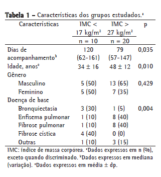 Foi encontrada uma diferença significante na relação entre a doença de base e o estado nutricional, mostrando que pacientes com bronquiectasias e fibrose cística estão mais relacionados com desnutrição, e aqueles com fibrose pulmonar e enfisema pulmonar apresentavam excesso de peso. O fato de que pacientes fibrocísticos são desnutridos é conhecido.(3,11) No entanto, dados da literatura também indicam a desnutrição de pacientes com enfisema pulmonar,(12) o que não vai de encontro com os nossos resultados.