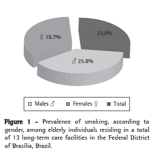 A cross-sectional, population-based study investigating elderly individuals in the city of Pelotas, Brazil, reported the prevalence of smoking to be 14%.(21) Another study showed that approximately 3.5 million elderly individuals aged 65 years or older in the United States smoke, the overall prevalence of smoking among elderly individuals being 26% (40% among males and 12% among females).(20)