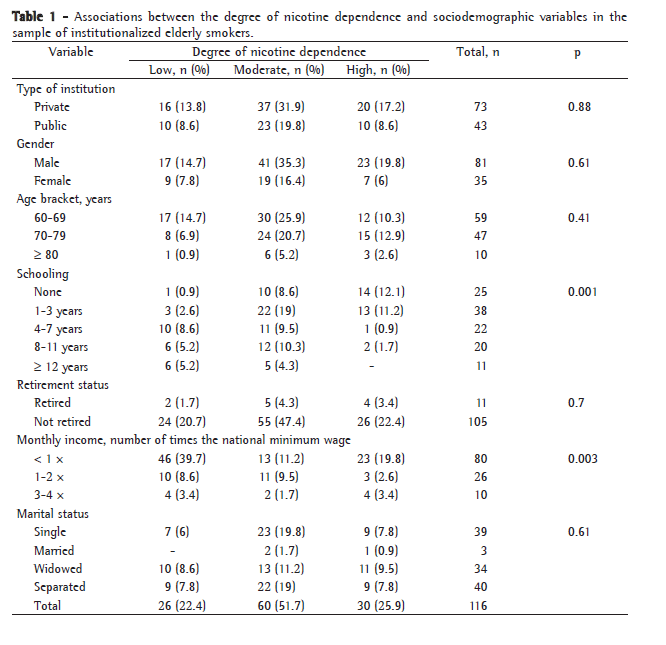 The present study revealed a significant association between the level of education and the degree of nicotine dependence. Among the elderly individuals evaluated, nicotine dependence decreased in inverse proportion to the number of years of schooling. A similar finding was reported in another study.(5) However, this finding is in disagreement with those of yet another study, in which smoking was found to be significantly associated with a lower level of education among younger individuals but not among older individuals.(22) In that study, the lack of an association between the level of education and smoking among the elderly individuals evaluated was attributed to a possible survival bias, since premature death is expected to occur more frequently among smokers in the lower socioeconomic strata.(22)