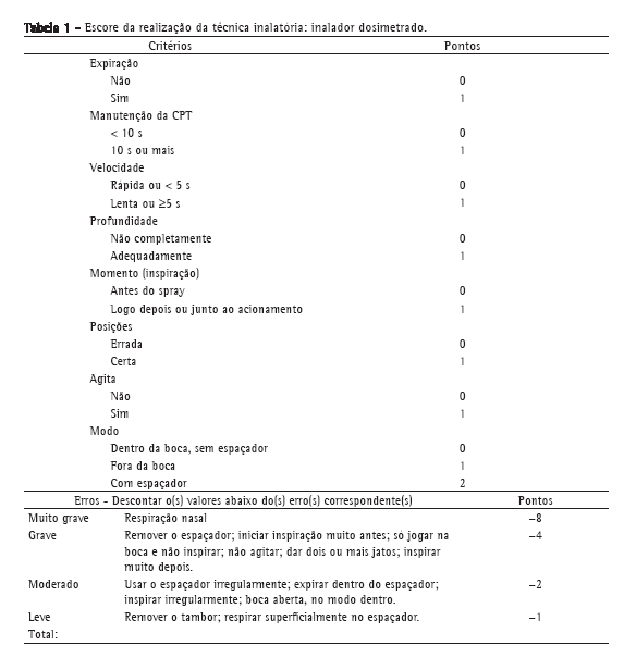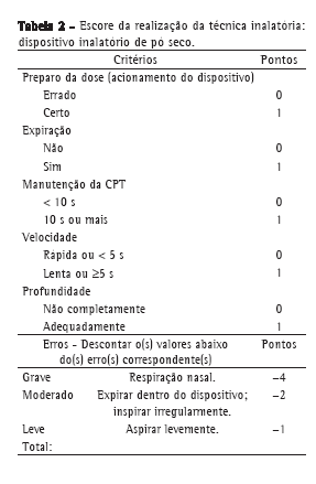 Esses valores foram adaptados e, no presente estudo, o escore máximo foi de 9 pontos para o uso de inalador dosimetrado e de 5 pontos para o uso de dispositivo de pó seco (Tabelas 1 e 2). Sendo assim, a técnica inalatória foi considerada satisfatória com a obtenção de escores ≥ 7 e ≥ 4, respectivamente, para a utilização do inalador dosimetrado e do dispositivo de pó seco.