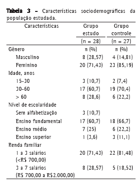 Foram incluídos 60 pacientes, divididos igualmente entre os grupos estudo e controle. Cinco pacientes foram excluídos, pois não compareceram ao atendimento na V3 por motivos pessoais. O estudo foi finalizado com 55 pacientes, dos quais 28 foram incluídos no grupo estudo e 27 no grupo controle. As características sociodemográficas dos pacientes estão mostradas na Tabela 3. Não houve diferenças estatisticamente significantes entre os grupos estudo e controle quanto aos aspectos sociodemográficos.