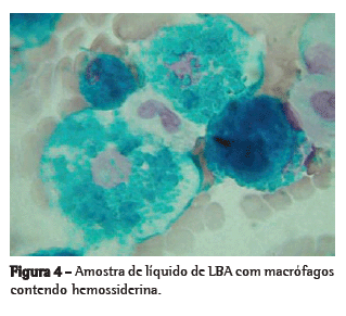 Embora a biópsia pulmonar seja considerada o padrão ouro, a presença de hemosiderin-laden macrophages (HLM, macrófagos contendo hemossiderina) no líquido de LBA é considerada crucial para o diagnóstico de hemossiderose pulmonar idiopática diante de achados sugestivos da doença, como hemoptise, infiltrado intersticial em radiografia de tórax e anemia ferropriva.(37,38) Um grupo de autores(38) revisou dados do perfil celular de líquido de LBA coletado de crianças para correlacionar a presença de HLM e hemossiderose e concluiu que a presença de 36% de HLM entre o total de macrófagos apresenta 100% de sensibilidade e 96% de especificidade para o diagnóstico da doença.