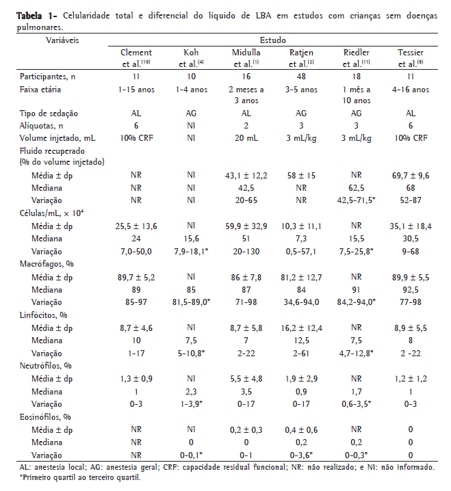 Nos últimos 20 anos, alguns estudos foram realizados para avaliar a celularidade do líquido de LBA em crianças e adolescentes saudáveis. No primeiro deles,(10) a LBA foi realizada sob anestesia local em 11 crianças e adolescentes submetidos à BF, principalmente para a avaliação de estridor laríngeo. Essa população apresentava exame físico, radiografias de tórax e saturação de oxigênio normais. Posteriormente, outros autores(2) descreveram a celularidade do líquido de LBA de crianças sem doenças pulmonares e submetidas à cirurgia eletiva. Crianças com sintomas respiratórios crônicos, infecções de vias aéreas superiores nos três meses anteriores e de infecções de vias aéreas inferiores nos dois anos anteriores à pesquisa, assim como com história de hiper-reatividade das vias aéreas e atopia foram excluídas.
