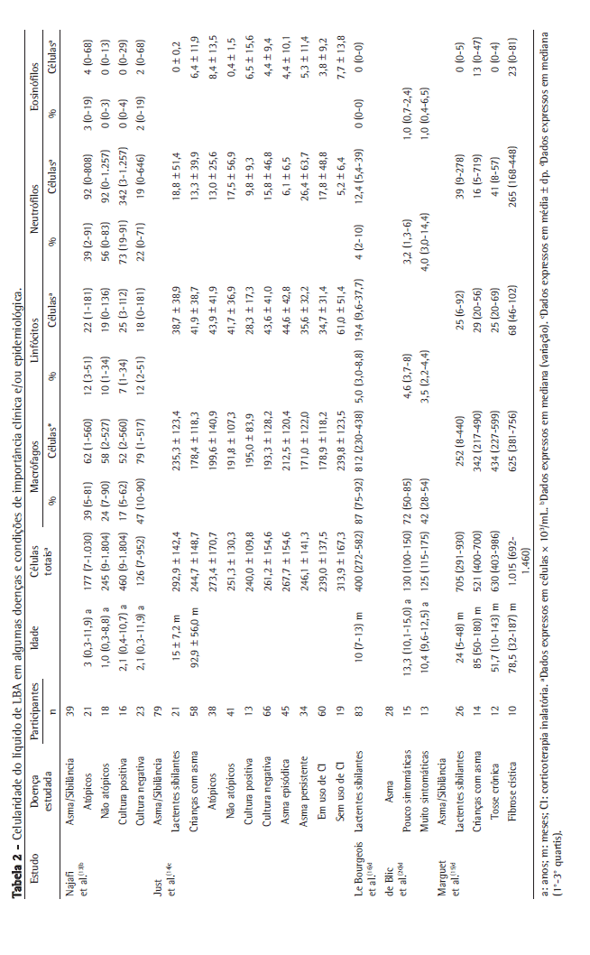 A seguir, são abordados aspectos relacionados à celularidade do líquido de LBA em algumas doenças e condições de elevada importância clínica e epidemiológica. Alguns destes dados estão sintetizados na Tabela 2.