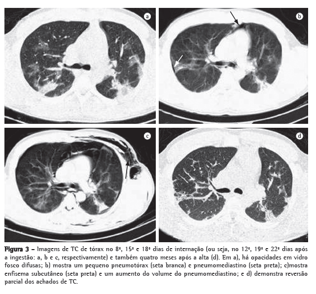 No segundo dia de internação (6º dia após a ingestão), o paciente apresentou hemoptise. A radiografia de tórax realizada no 8º dia após a ingestão mostrou infiltrado alveolar localizado (Figura 2b). Opacidades pulmonares, pneumomediastino, pneumotórax e enfisema subcutâneo foram detectados na TC de tórax (Figura 3). No sétimo dia de internação, os parâmetros gasométricos pioraram (Figura 1), e o paciente foi submetido a um segundo ciclo da mesma terapia imunossupressora. Posterior­mente, apesar de um episódio de neutropenia febril, ele se recuperou gradualmente e recebeu alta hospitalar, em bom estado, após quatro semanas, sem necessidade de oxigenoterapia domiciliar. Após quatro meses, o paciente estava trabalhando novamente e não tinha queixas, a não ser por dispneia após esforço físico intenso. Na ausculta torácica, ainda se podiam ouvir crepitações nos campos pulmonares inferiores, e havia sibilância universalmente distribuída, juntamente com atrito pleural no hemitórax direito. A TC de tórax realizada quarto meses após a alta também é mostrada na Figura 3.