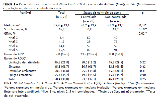 O nível de controle da asma foi determinado pelo ACT,(4) um questionário autoaplicável que é útil para quantificar o controle da asma e foi validado para esse fim. Esse questionário foi desenvolvido para avaliar o controle da asma e tem mostrado fortes propriedades avaliativas e discriminativas.(4) Consiste em 5 questões, relacionadas às quatro semanas que antecedem a avaliação, abordando múltiplas dimensões de controle, incluindo episódios de falta de ar, despertares noturnos, limitações nas atividades de vida diária, autoavaliação de controle da asma e necessidade de medicação de alívio. Cada questão é pontuada em uma escala de 6 pontos - de 0 (controle bom) a 5 (controle ruim) - e, portanto, o escore total varia de 5 a 25. Um escore ≥ 20 no ACT é definido como asma controlada.