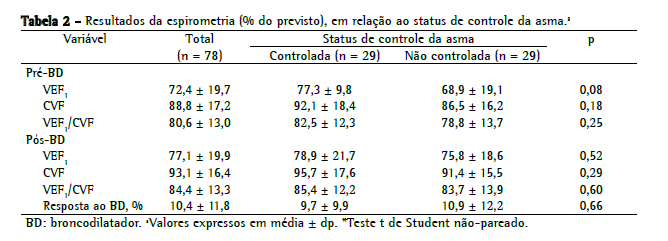 A asma não controlada foi significativamente mais comum nos pacientes em que a gravidade da asma foi classificada como nível 5 do que naqueles em que ela foi classificada como níveis 2, 3 ou 4, mesmo quando os três últimos foram combinados. Os escores de qualidade de vida não diferiram entre os pacientes com asma controlada e os com asma não controlada (Tabela 1). Além disso, os valores espirométricos pré- e pós-broncodilatador não diferiram entre os grupos asma controlada e asma não controlada (Tabela 2).