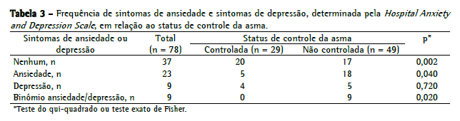 Dos pacientes avaliados neste estudo, 53% tinham ansiedade, depressão ou o binômio ansiedade/depressão. Isso está de acordo com os achados de vários estudos que mostram que a prevalência de ansiedade e transtornos depressivos é elevada entre pacientes asmáticos.(9,21,22)