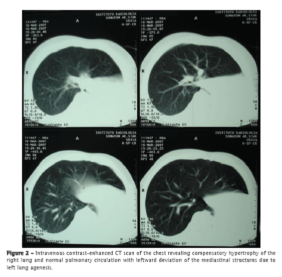 An 8-year-old White male patient from the city of Jaguarão, Brazil, sought medical attention. He had been born at term, and there had been no complications during pregnancy. He had a family history of asthma. Since early 2006, when he was 7 years old, the patient had been having attacks of wheezing, having been treated at home by his family. When he sought medical attention in February of 2007, the patient presented with a dry cough that progressed to wheezing and dyspnea for one month. He was hospitalized in his hometown. A chest X-ray performed at admission showed opacity of the left hemithorax, which was treated as bacterial pneumonia (Figure  1). Physical examination by a pulmonologist revealed that the patient was active, acyanotic, and breathing normally; pulmonary auscultation revealed retraction of the left hemithorax, dullness to percussion, and absent breath sounds on the left with wheezing on the right; cardiac auscultation revealed normal, rhythmic heart sounds without heart murmurs. The following tests were requested: chest HRCT; bronchoscopy; Doppler echocardiography; and abdominal ultrasound. Chest HRCT showed left lung agenesis, compensatory hypertrophy of the right lung, and normal right pulmonary circulation with leftward deviation of the mediastinal structures. There were no changes in upper abdominal structures (Figure  2). Abdominal ultrasound and echocardiography showed normal findings. Bronchoscopy revealed a blind-ending left main bronchus. Two months later, the patient returned for a follow-up evaluation. He presented with clinical signs of wheezing and was treated with a β2 agonist, which provided symptom relief. Chest X-ray findings remained consistent with left lung agenesis. Spirometry revealed moderate obstructive lung disease, with no significant variation in flow or volume after bronchodilator use. Pre-bronchodilator values were as follows: FVC  =   1.19 L (106% of predicted); FEV1  = 0.60  L/s (56% of predicted); and FEV1/FVC ratio  = 0.50 (55% of predicted). Post-bronchodilator values were as follows: FVC  = 1.21 L (108% of predicted); FEV1  = 0.61 L/s (57% of predicted); and FEV1/FVC ratio  = 0.51 (56% of predicted). Follow-up echocardiography, performed in 2008 and 2009, revealed right ventricular enlargement (right ventricular diameter  = 29 mm; reference value  = 7-18 mm) with normal pulmonary flow and no communications, shunts, or intracardiac obstructions.