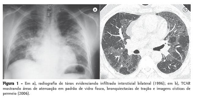 Os sintomas são inespecíficos: tosse seca, dispneia progressiva e aos esforços, baqueteamento/cianose digital, dor torácica, fadiga e perda ponderal.(7,8) À radiografia de tórax, se observa um padrão reticulomicronodular difuso, por vezes associado a um aumento linfonodal, e, na doença avançada, pequenas formações císticas.(9) À TCAR, podem ser vistas áreas de opacidades em vidro fosco bilaterais, áreas de consolidação, extensas áreas de hiperatenuação reticular e bronquiectasias de tração, achados que indicam fibrose.(9,10) Outros achados são faveolamento, nódulos centrolobulares e enfisema.(7) Os testes de função pulmonar revelam distúrbio restritivo.(8) O padrão histopatológico pode mostrar tanto pneumonia intersticial descamativa quanto pneumonia intersticial por células gigantes, com ou sem bronquiolite obliterante, e variado grau de fibrose intersticial.(11)