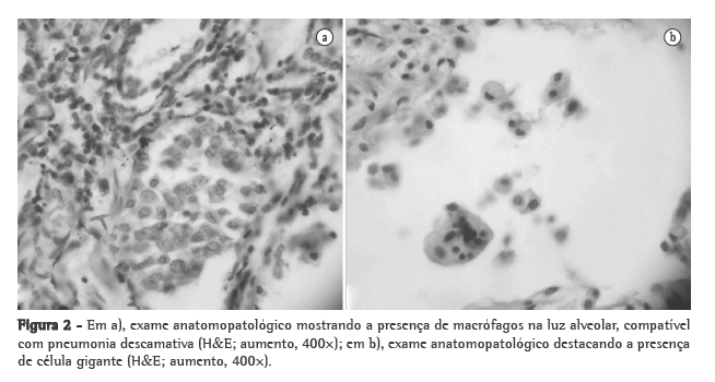 Paciente masculino, 50 anos, ex-encanador industrial em plataforma de petróleo por 9 anos, admitido em outro hospital em 1996 para a investigação de um quadro de dispneia aos esforços, tosse pouco produtiva, febre vespertina e artralgias, com início há 5 anos daquela admissão e com piora nos três meses precedentes. Relatava tratamentos prévios para pneumonia em quatro ocasiões, com melhora temporária do quadro; tinha história de hipertensão arterial sistêmica e tabagismo (20 anos-maço) que havia interrompido há 5 anos. A radiografia de tórax evidenciou infiltrado intersticial bilateral (Figura 1A); a espirometria revelou distúrbio restritivo [VEF1 = 1,56 L (46,9% do previsto); CVF = 2,01 L (51,2% do previsto); VEF1/CVF = 77,9% (91,6% do previsto)]; no teste da caminhada de seis minutos, o paciente apresentou uma redução significativa da SpO2, que variou de 96% para 87%; sorologias para HIV, VDRL, hepatite B e C foram negativas; FAN = 1:160; e anti-ENA negativo. Foi submetido à biopsia pulmonar a céu aberto, que demonstrou pneumonia intersticial descamativa (Figura 2A), iniciando tratamento para pneumonia intersticial idiopática com prednisona 60 mg/dia por três meses e redução gradativa da dose. O paciente persistiu afastado da exposição após o inicio dos sintomas. Ficou sem acompanhamento médico entre 1998 e 2005, quando procurou o ambulatório de doenças intersticiais em nosso hospital, sem uso de medicação e com piora da função pulmonar. Ao exame físico, apresentava crepitações finas nos terços inferiores e posteriores de ambos os hemitórax. A TCAR mostrou atenuação em padrão de vidro fosco e tênue faveolamento de permeio (Figura 1B). Foi solicitada a revisão de lâmina da biopsia pulmonar, na qual se detectou a presença de células gigantes (Figura 2B). Questionado quanto à exposição ocupacional, o paciente revelou ter trabalhado como encanador industrial na indústria petrolífera, onde fazia uso de ferramentas (esmerilhadeiras, lixadeiras) contendo discos de liga de metal duro na montagem de tubulações. Referiu que havia o desgaste desses discos com o uso, sendo necessária a afiação, e que usava apenas uma viseira como proteção. Exerceu essa atividade, quase continuamente, pelo menos cinco dias por semana entre 1982 e 1991, quando os sintomas iniciaram.