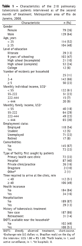 This was a cross-sectional study conducted in the state of Rio de Janeiro between April of 2007 and May of 2008. Pulmonary TB patients enrolled in the Tuberculosis Control Programs of the 8 cities investigated in the present study were eligible for inclusion. The inclusion criteria were as follows: presenting with pulmonary TB confirmed by sputum examination (sputum smear microscopy, culture for Mycobacterium tuberculosis, or both); being under treatment for 5-12 weeks (5-12 weeks); being under treatment and having been interviewed in one of 20 primary health care clinics (of which 11 provided DOTS and 9 did not) or in one of 3 hospitals. The 23 health care facilities involved are distributed across 8 cities (Rio de Janeiro, Belford Roxo, Itaboraí, Duque de Caxias, Nilópolis, Queimados, Niterói, and São Gonçalo) that are among the 14 cities with the highest disease burdens in the state of Rio de Janeiro. Those cities account for 72% of the population of the state of Rio de Janeiro, as well as for 86% of all TB cases in the state.(4) A convenience sample of the clinics was selected by the Rio de Janeiro State Department of Health. We excluded patients who had difficulty in speaking and those who were younger than 18 years of age.
