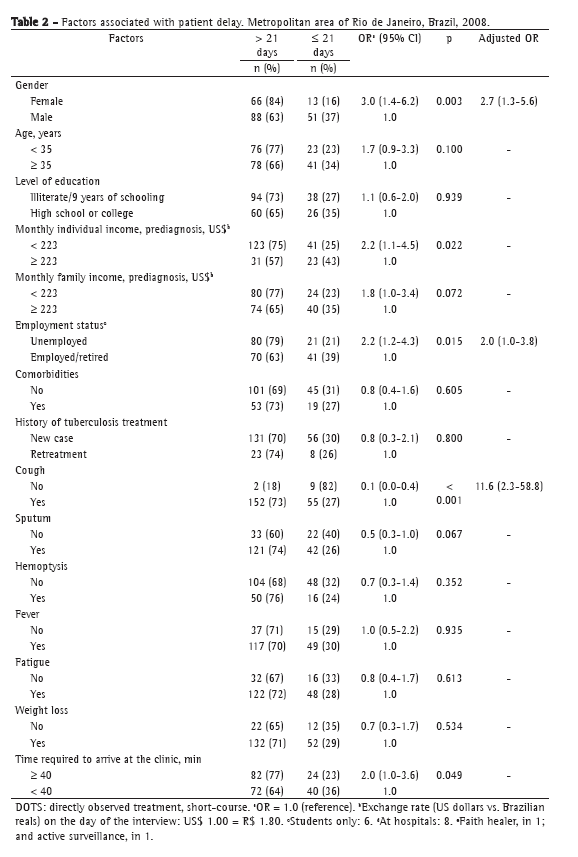 Our study has some limitations. The questionnaire used did not address smoking, evaluate the degree of knowledge of TB, characterize beliefs regarding TB, or attempt to explain why the diagnosis was delayed; it only sought to find associated factors to be addressed in future qualitative studies. In addition, the study design did not allow us to evaluate patients who have no access to health care and consequently to the diagnosis of the disease. Finally, the fact that we began to collect information when patients had been under treatment for 2 months might constitute a recall bias. However, our study has certain strengths: it involved 8 of the 14 priority cities in the state of Rio de Janeiro; it included only patients in whom the diagnosis had been confirmed; the questionnaire employed had previously been used in a pilot study, which allowed us to improve the instrument for data collection; and the analysis of the data was consistent, despite the different cut-off points used for the outcome.