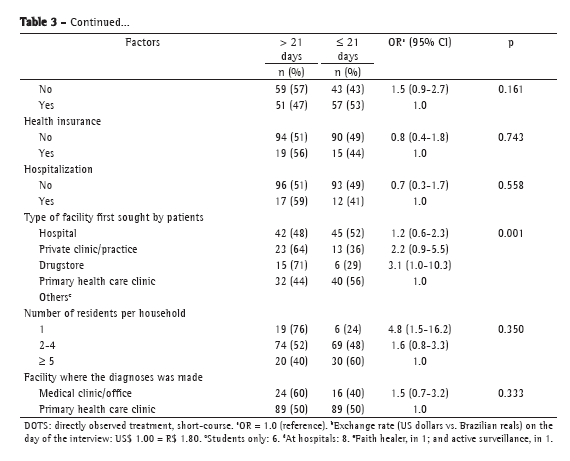 We used a questionnaire to collect demographic and socioeconomic data, as well as data regarding health insurance, clinical history/previous comorbidities, days elapsed between symptom onset and diagnosis of pulmonary TB, time required to commute from the patient residence to the health care clinic, type of facility first sought by the patient, DOTS availability, and hospitalization. The instrument was administered by previously trained students. The time frames were classified as patient delay (time from symptom onset to initial medical visit) and health care system delay (time from initial medical visit to diagnosis). The instrument employed has been validated in various English-speaking and Spanish-speaking countries,(7,8) and the Brazilian Portuguese-language version had been validated in a pilot study conducted prior to the collection of the data presented here.