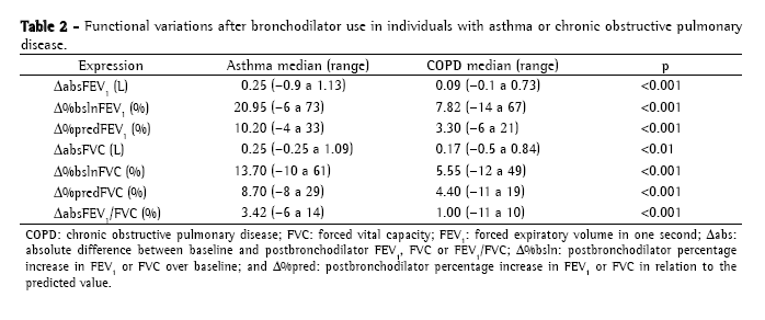 Comparing prebronchodilator and postbronchodilator values, the mean increase in FVC was from 2.39 L to 2.68 L among the patients with asthma (p < 0.001) and from 2.91 L to 3.09 L among the patients with COPD (p < 0.001). The mean increase in FEV1 was from 1.32 L to 1.59 L among the patients with asthma (p < 0.001) and from 1.49 L to 1.61 L among the patients with COPD (p < 0.001). The remaining parameters also presented statistically significant variations in the median values obtained for both groups (Table 2).
