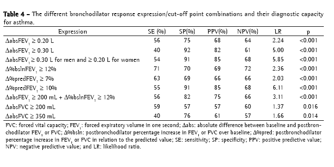 In Table 4, the sensitivity, specificity, predictive values and likelihood ratios are shown for the various expressions of bronchodilator response, using asthma as a reference.