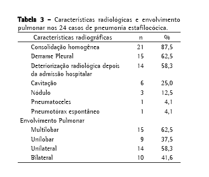 As características individuais dos 24 pacientes com pneumonia estafilocócica estão especificadas na Tabela 1. A média de idade foi de 45,7 anos (com uma variação de 14 a 89 anos). Quinze casos (62,5%) eram homens e 9 casos (37,5%) eram mulheres. A média de permanência hospitalar entre os pacientes que obtiveram alta foi de 33 dias, variando de 21 a 54 dias. Ocorreram 4 óbitos, que correspondem a 16,6% dos casos.