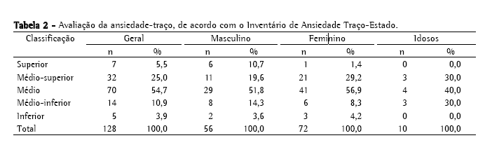 A avaliação de ansiedade-traço e ansiedade-estado foi feita apenas nos 128 fumantes que possuíam pelo menos o 2º grau completo de escolaridade, conforme requisito mínimo para aplicação do IDATE.(14) Esta classificação traduz uma avaliação qualitativa, categorizada da seguinte forma: