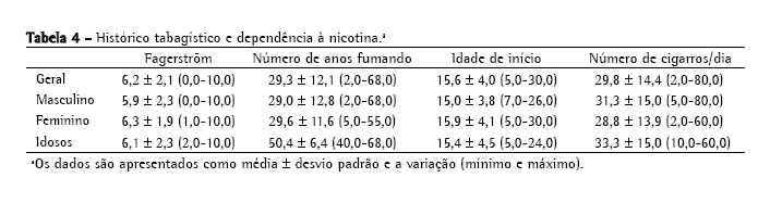 O tempo médio de tabagismo, o consumo médio diário de cigarros e o nível de dependência à nicotina (de acordo com a avaliação pelo questionário de tolerância de Fagerström) não mostraram diferenças estatisticamente significantes entre os sexos (Tabela 4). A comparação da idade de início entre os sexos apresentou p = 0,096, sendo menor para o sexo masculino.