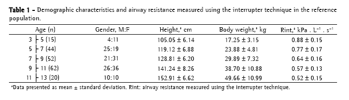 Reference values in healthy children, determined using the interrupter technique, have been developed with the use of equipment commercially available for Rint determination. The use of the Micro Medical device (Micro Medical Inc., Rochester, Kent, UK) has been referred to in publications by groups in Holland,(8-11,13) Italy(5) and England.­(14) Reference equations devised using the Jaeger apparatus (Jaeger, Würzburg, Germany) have been published in Holland.(3,15) In France, reference values for Caucasian children have been determined using a commercially unavailable tool (Spiroteq apparatus; Dyn'R Ltd, Toulouse, France).(16)