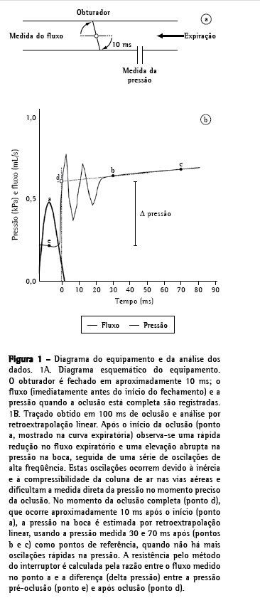 A medida se baseia no princípio de que o fluxo de ar é interrompido por um breve período, no qual ocorre um rápido equilíbrio entre a medida de pressão na boca e a pressão alveolar. Através de Rint, registramos o fluxo expiratório imediatamente antes da oclusão pelo obturador e também a pressão na boca imediatamente após a oclusão. A resistência das vias aéreas é calculada dividindo-se a mudança na pressão na boca pelo fluxo expiratório.(9-11) Na Figura 1, apresentamos um diagrama simplificado do funcionamento de Rint e a análise dos dados de pressão e fluxo obtidos durante a manobra. Em pulmões saudáveis, o equilíbrio entre as pressões na boca e a pressão alveolar é quase instantânea. Quando existe aumento da resistência ao fluxo aéreo e da complacência das vias aéreas superiores, o tempo de equilíbrio da pressão, após a interrupção, pode ser mais prolongado.(9,12)
