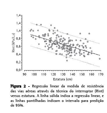 Em relação aos valores de referência de Rint propriamente ditos, em concordância com a maioria dos estudos,(5,13,15,16) o modelo linear, quando testado, foi considerado melhor do que o modelo exponencial para descrever as relações entre estatura e Rint.(8,14)