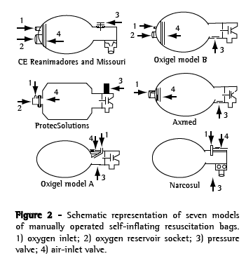 As shown in Figure 2, the resuscitation bags tested presented the following characteristics regarding the direction of the oxygen inflow into the bag: parallel to the air-inlet valve-­ProtecSolutions; perpendicular to the air-inlet valve-CE Reanimadores, Missouri, Oxigel model B, and Axmed; and directed to the interior of the bag-Oxigel model A and Narcosul.