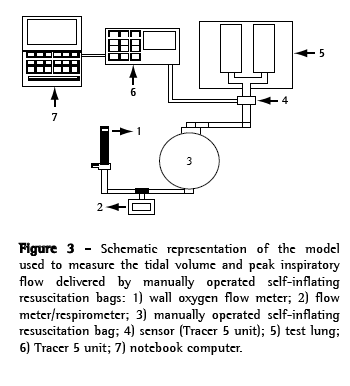 A test lung (Vent Aid, TTL-49504; Michigan Instruments, Grand Rapids, MI, USA), a device for measuring respiratory mechanics (Tracer 5; Intermed, São Paulo, Brazil), a wall oxygen flow meter (Becton Dickinson, Franklin Lakes, NJ, USA), a flow ­meter­/­respirometer (953; Oxigel, São Paulo, Brazil), and a notebook computer running the Wintracer software, version 3.3beta (Intermed, São Paulo, Brazil) were used.Seven models of manually operated self-inflating resuscitation bags were tested: Oxigel model A; Oxigel model B; CE Reanimadores (São Paulo, Brazil); ProtecSolutions (Wellington, New Zealand); Missouri (Embu, Brazil); Axmed (São Paulo, Brazil); and Narcosul (Porto Alegre).