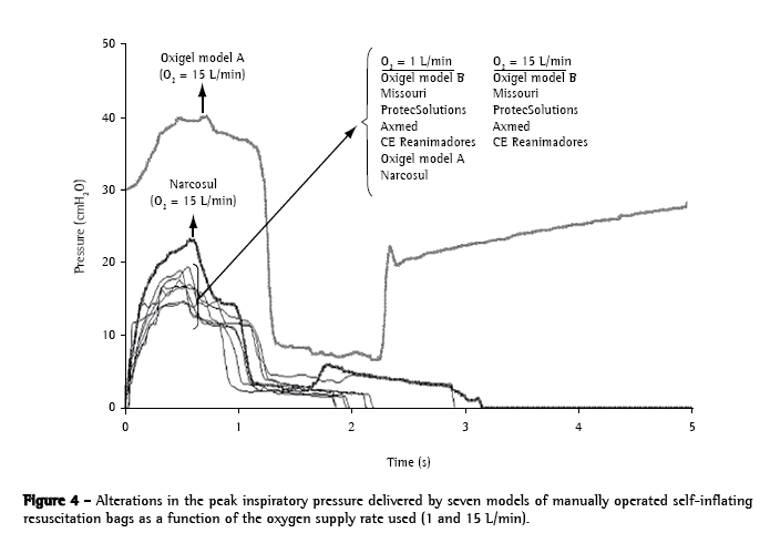 The peak inspiratory pressure delivered by the Oxigel model A resuscitation bag when receiving oxygen at a rate of 15 L/min was approximately 155% greater than that delivered when receiving oxygen at a rate of 1 L/min. Under the same circumstances, the peak inspiratory pressure delivered by the Narcosul resuscitation bag was approximately 105% greater (Table 1).