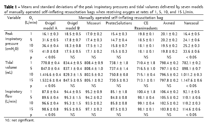 During the handling of the resuscitation bags, the mobility of the patient valve was checked, and the variables tidal volume and peak inspiratory pressure values recorded by the Tracer 5 unit were transferred to the notebook computer. The means and standard deviations were calculated using the BioEstat 3.0 and the Excel XP programs. Analysis of variance was used.