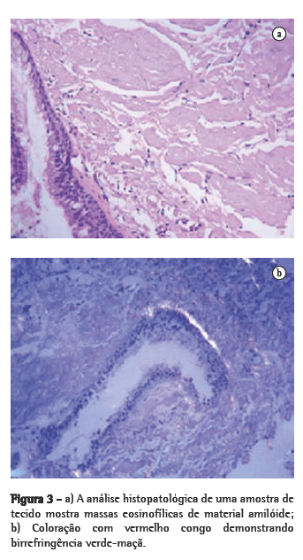 A fibrobroncoscopia foi realizada por três vezes durante a abordagem diagnóstica. Todos os exames revelaram compressão extrínseca do lado direito da traquéia, infiltrados mucosos nodulares distribuídos a partir da carina principal para os brônquios principais e intermediários direitos, assim como estenose do brônquio intermediário (Figura 2). Somente durante a terceira fibrobroncoscopia foi possível obter uma amostra utilizável dos infiltrados endobrônquicos. A análise histopatológica da amostra tecidual corada com vermelho congo demonstrou birrefringência verde-maçã quando visualizada sob luz polarizada (Figura 3). Um diagnóstico de amiloidose foi fortemente sugerido. Amostras de tecido adiposo periumbilical e de medula óssea não evidenciaram doença sistêmica. Os resultados do exame de urina (proteinúria e creatinúria por 24 h) e perfil protéico estavam dentro dos limites de normalidade. Não foram reveladas anormalidades no ecocardiograma, eletrocardiograma e ultra-sonografia abdominal. O diagnóstico foi de amiloidose traqueobrônquica. Após seis meses, o paciente somente fez uso de broncodilatadores de curta duração, apresentando sintomas respiratórios leves e resultados normais nos testes de função pulmonar.