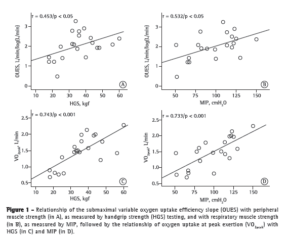 The OUES depends on the development of metabolic acidosis, on muscle mass, on oxygen extraction and use, and on physiological pulmonary dead space, which is affected by lung perfusion and structural integrity.(8) It has been suggested that the relationship between muscle strength and OUES depends on muscle mass. However, to our knowledge, this has never been investigated.