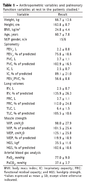 The data related to anthropometric variables, spirometry, lung volumes, muscle strength, and blood gas analysis in the study population are shown in Table 1. The study sample consisted of 21 patients (15 men), the mean age being 60.7 ± 7.8 years. Lung volumes, peripheral muscle strength, and respiratory muscle strength (all in % of predicted) were within the normal range, as were PaO2 and PaCO2 at rest.
