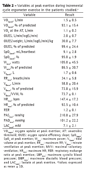 For CPET, we used the criteria and protocols recommended in national guidelines.(13) The test was performed in a metabolic system (Oxycon Delta system; Jaeger, Würzburg, Germany) with a mixing chamber for proportional ergospirometry. The system was connected to a program (OxyconLAB; Jaeger) and a cycle ergometer (ER 900; ergoline GmbH., Bitz, Germany) with electromagnetic brakes, the workload and protocol being generated by the program. Calibration was performed before each test, in accordance with the manufacturer protocols, and biological calibration was performed every three months. We defined VO2peak as the mean of the last 15 s at peak exertion. Symptom-limited maximal exercise tolerance was defined as intolerable shortness of breath or leg fatigue preventing cycling at > 50 breaths/min. Maximal voluntary ventilation (MVV) was estimated by multiplying FEV1 by 37.5.(15) The anaerobic threshold (AT) was determined by the V-slope method.(19) The test protocol (incremental ramp protocol) was individualized on the basis of the Wasserman formula to increase the workload and on the basis of the predicted maximal VO2,(20) the predicted value being based on the reference values for the Brazilian population proposed by Neder et al.(21) Lactate was determined from a fingertip blood sample by reflectance photometry (660 nm) with a portable system (Accutrend Lactate; Roche, Mannheim, Germany).