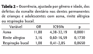 A regressão logística revelou que o risco de defeitos do esmalte dentário é aproximadamente 11 vezes maior em crianças com asma (Tabela 2).