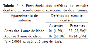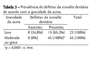 A ocorrência de defeitos do esmalte dentário correlacionou-se com a gravidade da asma (rφ: 0,51, p = 0,0001), bem como com o aparecimento de sintomas (rφ: 0,67, p = 0,0001), como se pode ver nas Tabelas 3 e 4, respectivamente.
