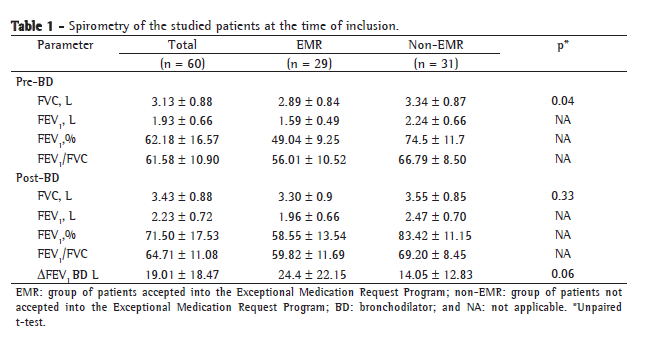 ResultsSixty patients were included in the study. The group of patients who received free medication (EMR group) presented lower prebronchodilator FVC values, and this difference was statistically significant. The variable FEV1 was not statistically evaluated, since it was not related to any of the inclusion criteria. The two studied groups were homogeneous in relation to postbronchodilator ΔFEV1 (Table 1).
