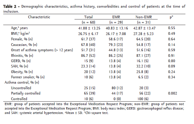 DiscussionThe criteria for patient acceptance into the EMR program, outlined in Complementary Directive SAS/MS 12, issued on 12 November, 2002,(4,10) were appropriate for the identification of the patients presenting the greatest disease severity. Those criteria stratified patients based on the frequency at which they used health care resources. The patients selected to receive medication from the EMR presented a higher number of emergency room visits in the preceding year, a higher number of exacerbations and a more frequent need for corticosteroid pulses. It is known that patients with severe asthma who achieve control of the disease visit the emergency room less frequently and are less likely to receive oral corticosteroid pulses, although these severity markers present no significant association with corticosteroid dependency.(17)