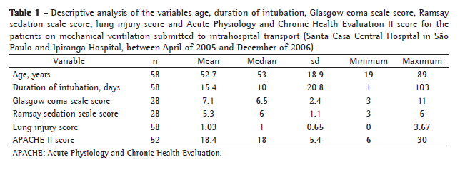 We evaluated 48 patients, in a total of 58 transports, of which 30 occurred at the Santa Casa Central Hospital in São Paulo and 28 occurred at the Ipiranga Hospital. However, not all variables were considered in the 58 ­transports. In some cases, these data were not included on the data collection form. In other cases, the data had to be excluded from the analysis. For example, since venous blood gas analysis findings were considered inappropriate and only arterial blood gas analysis results were included, these data were evaluated in only 46 cases.