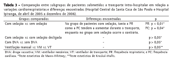 Os pacientes também foram divididos em subgrupos e comparados em relação às seguintes variações cardiorrespiratórias: FC, FR, PAS, PAD, SpO2, pH, PaCO2, PaO2, SaO2 e PaO2/FiO2. Os subgrupos analisados e as diferenças encontradas estão descritos na Tabela 3.