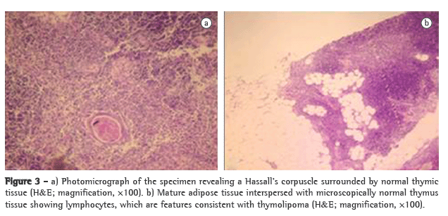 Macroscopically, the resected tumor was encapsulated by a soft smooth elastic surface and composed of a yellowish tissue. The histopathological diagnosis revealed a benign thymolipoma consisting of mature fatty tissue and hyperplastic thymic structures with Hassall's corpuscles (Figure 3).
