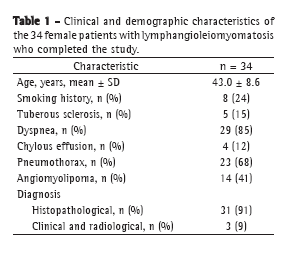 This was a prospective clinical study in which all female LAM patients (clinical and radiological diagnosis or histopathological diagnosis, or both) under follow-up treatment between November of 2006 and July of 2009 at the Outpatient Clinic for Interstitial Diseases of the Hospital das Clínicas da Faculdade de Medicina da Universidade de São Paulo (HC-FMUSP, University of São Paulo School of Medicine Hospital das Clínicas), in the city of São Paulo, Brazil, were invited to participate. We also evaluated a control group comprising 10 women who had no respiratory disease, no other medical conditions, and no history of smoking. The study was approved by the HC-FMUSP Research Ethics Committee, and all participants gave written informed consent.
