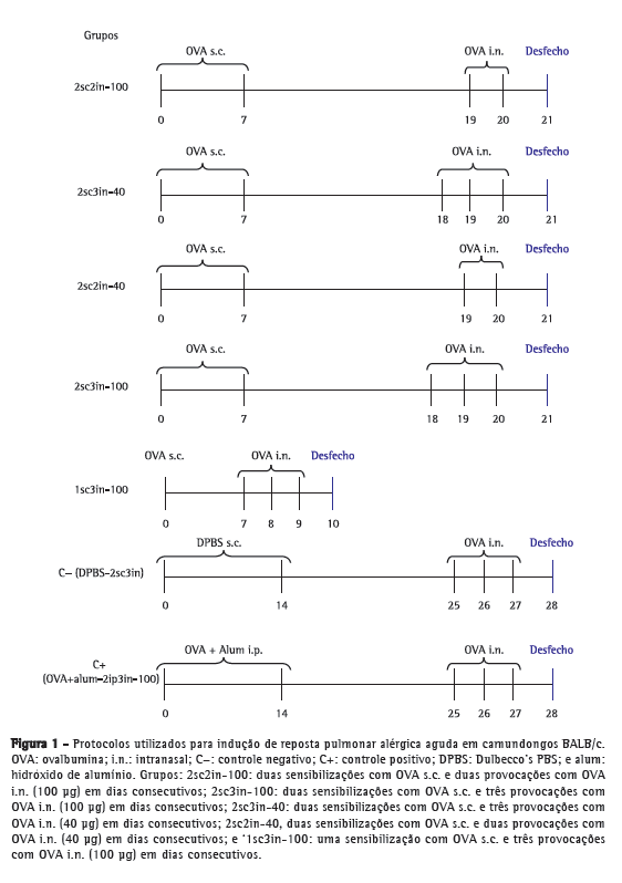 Dentre os animais estudados, o camundongo isogênico é o mais popular, devido ao baixo custo, o detalhado conhecimento da sua genética e pela clara resposta imune Th2 desenvolvida em seus pulmões quando expostos a alérgenos específicos.(3) Classicamente, camundongos da linhagem BALB/c são expostos à ovalbumina por sensibilização i.p., em um intervalo de 14 dias, juntamente com um adjuvante - hidróxido de alumínio (alum); apesar de seu uso rotineiro, essa é uma forma artificial de potencializar a resposta alérgica pulmonar.(5) Esse tem sido o protocolo padrão mais utilizado na literatura como modelo murino de asma. A superação de duas limitações frequentemente descritas (uso de adjuvante e tempo prolongado de protocolo) poderia ser atraente para a realização de modelos murinos de asma mais aprimorados, principalmente em testes pré-clínicos de novos fármacos.