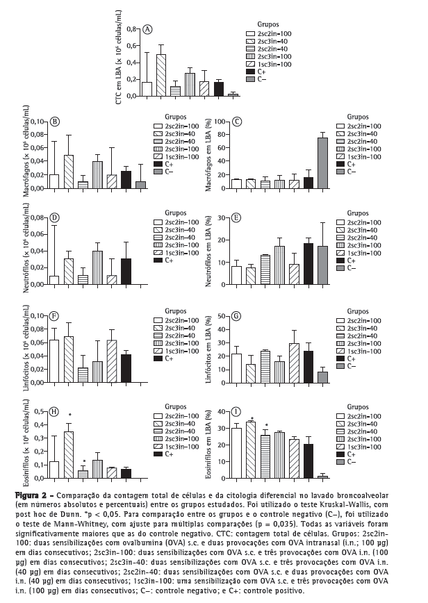 A análise estatística foi realizada através do programa Statistical Package for the Social Sciences versão 17.0 (SPSS Inc., Chicago, IL, EUA). Após a análise descritiva das variáveis, o teste de Kruskal-Wallis foi utilizado, com análise post hoc de Dunn, para aquelas comparações que atingiram significância estatística. O grupo C− foi testado estatisticamente em separado com os grupos estudados, utilizando-se o teste de Mann-Whitney, com ajuste para múltiplas comparações. O nível de significância estabelecido foi de 0,05. Como desfecho principal, utilizamos a contagem de eosinófilos nas amostras de LBA, pelo fato de que o eosinófilo é a célula efetora do sistema imune mais importante nesse modelo experimental.
