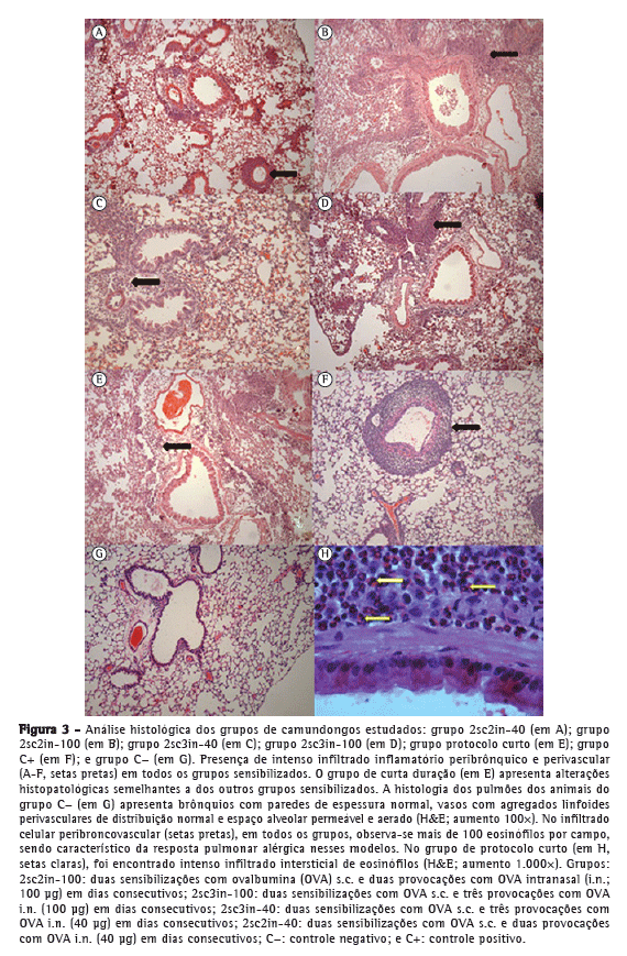Buscando uma alternativa para não utilizar o adjuvante em modelos murinos de asma, Conrad et al. demonstraram recentemente que a sensibilização s.c. por ovalbumina, sem a utilização de adjuvante, resulta em uma resposta pulmonar alérgica semelhante àquela em protocolos previamente estabelecidos.(6,7) Os resultados daquele estudo permitem excluir o uso do adjuvante em modelos murinos de asma em estudos futuros, que tem resultado em críticas justificadas sobre a forma artificial corrente de estudar asma em modelos animais. No entanto, naquele estudo utilizaram-se três sensibilizações, com intervalos de 7 dias, mantendo o protocolo ainda muito longo. Com isso, em relação ao tempo de duração dos modelos murinos de asma, protocolos de curta duração, particularmente associados à ausência de adjuvante, não foram testados até o presente. A viabilidade de um modelo desse tipo seria uma forma interessante de estudar preliminarmente novas terapias em asma, particularmente aquelas relacionadas à resposta pulmonar eosinofílica, desfecho esse central em alvos terapêuticos de asma de origem atópica. No cenário da indústria farmacêutica, protocolos longos têm sido uma limitação significativa no estudo de novos fármacos.(8)