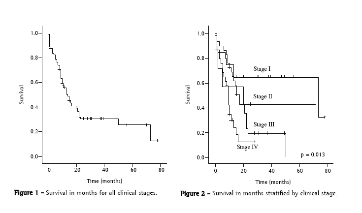 Overall survival was obtained using the Kaplan-Meier method.(16) Survival stratified by staging, histological type, and gender was also obtained. The differences among the survival curves were determined using the log-rank test, and the level of significance was set at 5%. The analyses were performed using the SAS program for Windows, version 8.02 (Statistical Analysis System, Cary, NC, USA).(17)